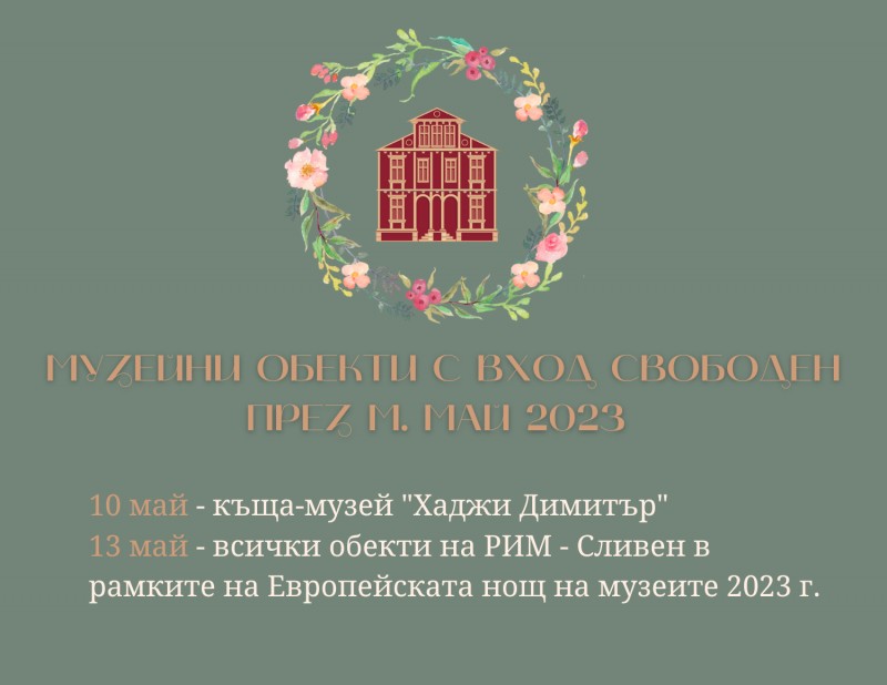 С вход свободен през настоящия месец Ви очакваме на 10 май в къща-музей "Хаджи Димитър", когато се навършват 183 години от рождението на легендарния сливенски войвода. В събота, 13 май, заповядайте отново в нашите обекти, където за поредна година ще проведем Европейската нощ на музеите.