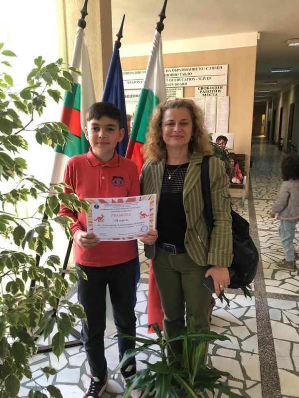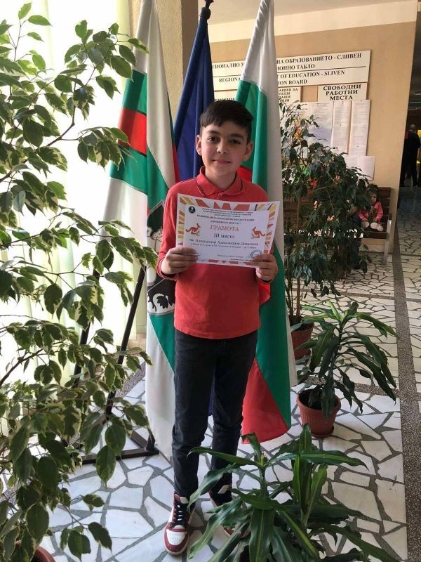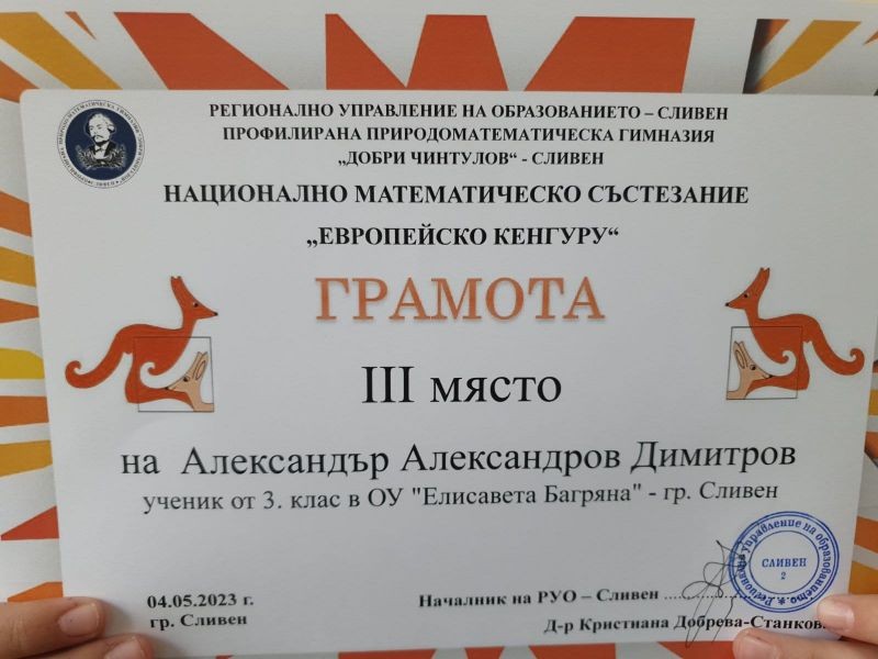 На 5 май в РУО-Сливен бяха връчени грамотите на класираните участници на първите три места от всеки клас в Националното математическо състезание „Европейско кенгуру“ за област Сливен. С радост ви представяме нашия участник Александър Александров Димитров от 3. б клас, който се класира на 3-то място сред третокласниците в областта с резултат от 68 т. Грамотите на класираните участници връчи лично началникът на РУО – Сливен – д-р Кристиана Добрева-Станкова. Поздравяваме Александър и му пожелаваме още много успехи в областта на математиката!