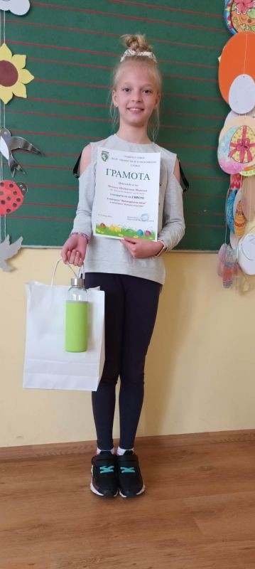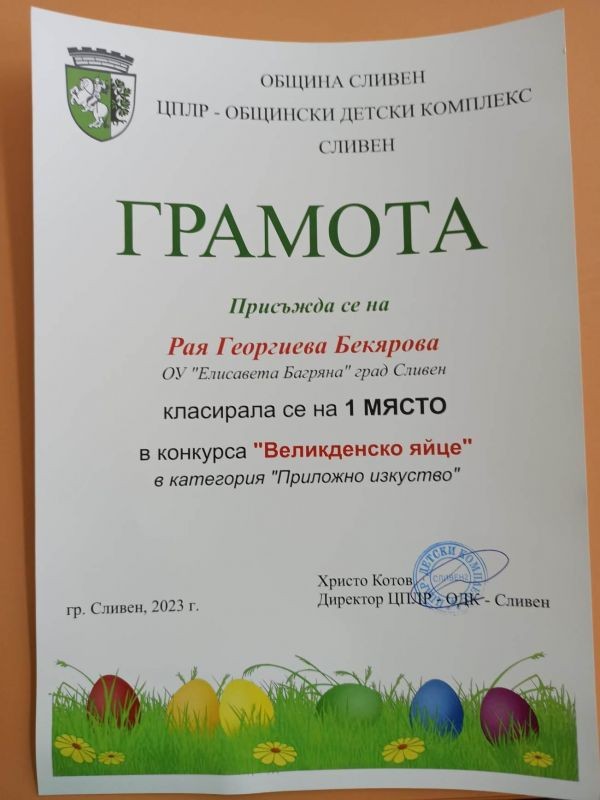 Почетното първо място в конкурса "Великденско яйце" зае Рая Георгиева от 3. "а" клас от клуб "Млад художник" с ръководител г-жа Здравка Долушанова. На 9 май се състоя награждаването на класираните участници в конкурса, организиран от ЦПЛР - Общински детски център - гр. Сливен.