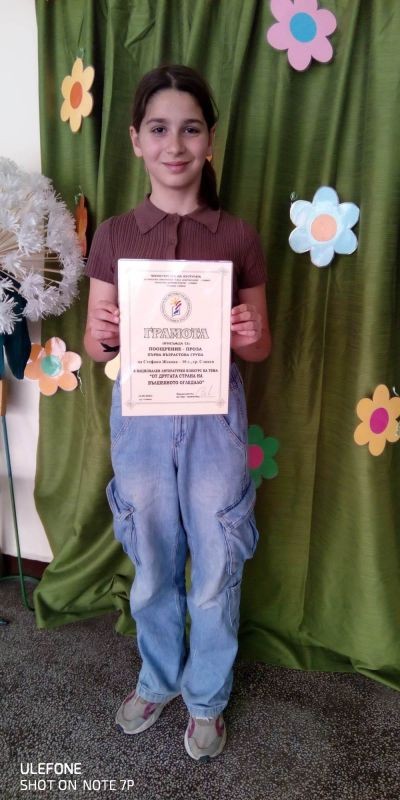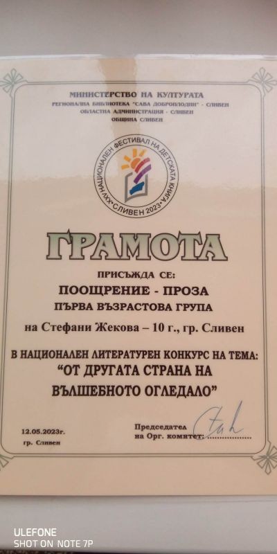 Стефани Жекова от 4. "г" клас с класен ръководител г-жа Жана Ташева получи поощрителна награда в раздел "Проза" от Националния конкурс “От другата страна на вълшебното огледало“.