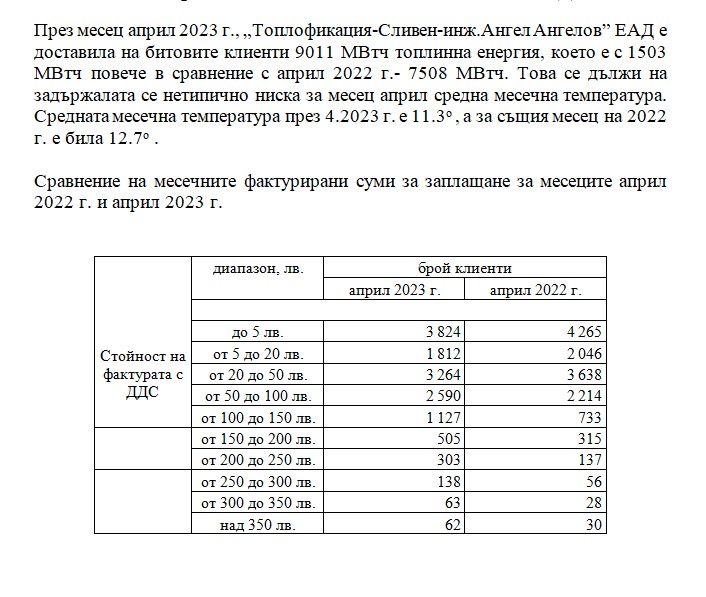 Анализ на потреблението през месец април 2023 г. на клиенти на „Топлофикация-Сливен-инж.Ангел Ангелов” ЕАД