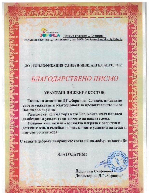Радваме се и ние от „Топлофикация – Сливен – инж.Ангел Ангелов” ЕАД, че станахме част от празника по случай деня на детето в ДГ „Зорница”. Бяхме поканени и посрещнати с много усмивки, радост и искрени детски очички. Нашият подарък за тяхната покана е дeтски кът за отдих, отмора и още повече весели игри.