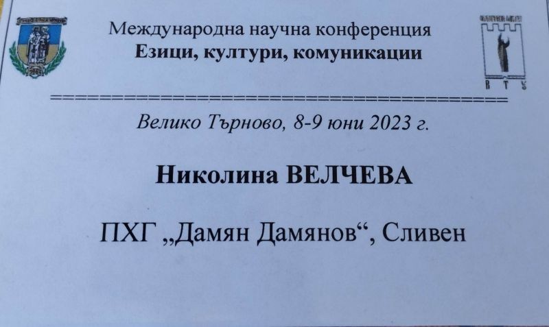 На 9 юни Николина Велчева – учител по български език и литература в Хуманитарна гимназия „Дамян Дамянов“, се представи с доклад на годишната международна научна конференция „Езици, култури, комуникации“. Конференцията се организира от Филологическия факултет на Великотърновския университет „Св. Св. Кирил и Методий“ от 8 до 10 юни в старопрестолния град и се провежда в няколко тематични области: Езици и култури; Литератури и култури; Комуникации и медии; Преводът между теорията и практиката; Методика на езиковото и литературното обучение. Докладите от конференцията ще бъдат публикувани в периодичното издание “Studia Philologica Universitatis Velikotarnovensis / Филологически изследвания" на Великотърновския университет и в поредицата „Българистични проучвания“.