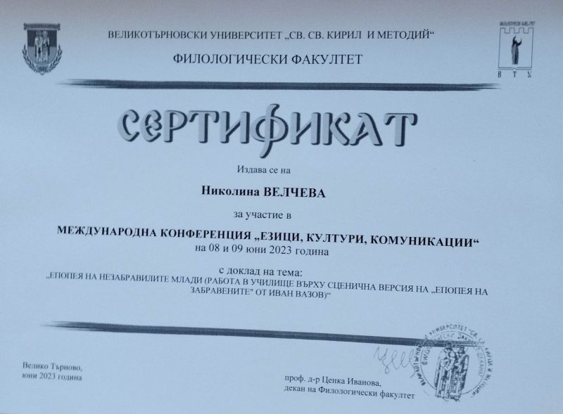 Научният доклад на Николина Велчева е в област „Методика на езиковото и литературното обучение“ и е посветен на работата върху сценичната версия на „Епопея на забравените“. Постановката по текстовете на Иван Вазов бе реализирана от театралната трупа на Хуманитарната гимназия.