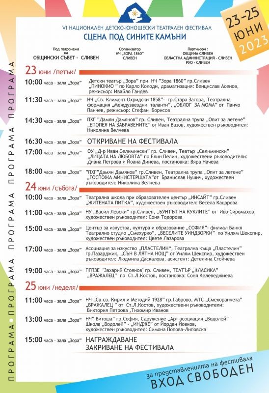 За поредна година Националният детско – юношески театрален фестивал „Сцена под Сините камъни” в Сливен събира млади театрални формации от страната. Шестото издание започва на 23 юни, петък. Официалното откриване ще се състои в зала „Зора“ от 16.30 ч.