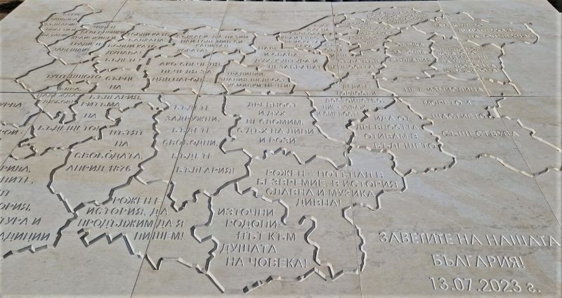 В постамента на Пилон „Рожен“, представляващ картата на България, са очертани 28-те области на страната и са вдълбани техните послания към идните поколения.