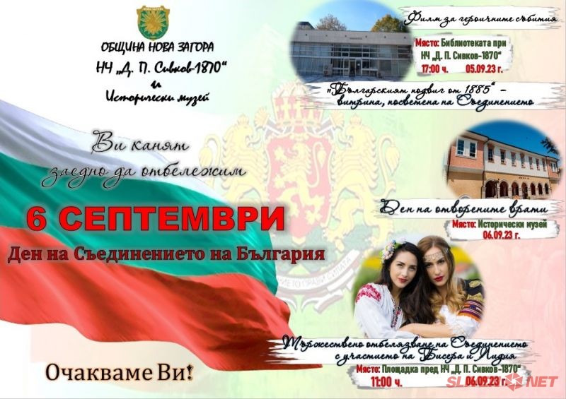Каним Ви на 5 септември от 17:00 ч. в Библиотеката, за да видите витрина, посветена на Съединението под надслов „Българският подвиг от 1885“ и филм за героичните събития. На 6 септември Исторически музей Нова Загора обявява „Ден на отворени врати“ и ще Ви очаква, за да се запознаете отблизо с историческите събития в един открит урок, поднесен от уредника на музея Георги Камбуров. А от 11:00 ч. заповядайте на площадката пред НЧ „Д. П. Сивков – 1870” , за да отбележим тържествено паметната дата в един празник, със специалното участието на талантливия дует Бисера и Лидия.