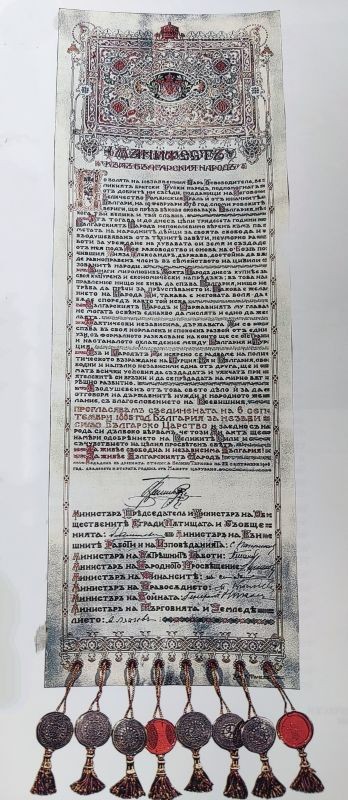 Въодушевен от това свето дело и за да отговоря на държавните нужди и народното желание, с благословението на Всевишния прогласявам съединената на 6 септемврий 1885 година България за независимо Българско Царство и заедно с народа си дълбоко вярвам, че този Ми акт ще намери одобрението на Великите Сили и съчувствието на целия просветен свят.