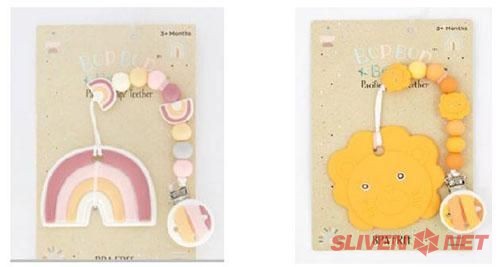 Забранени за продажба са и два модела бебешки чесалки за зъби с номера BBOPE-12-P и BBOPE-21-L на бранда Danbar и отново с произход Китай. Опасността при тях е, че верижката може да се разпадне на малки части и при поглъщане от детето да предизвика задушаване. Артикулите са изтеглени от пазара и от крайните потребители.