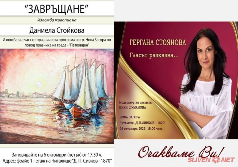 На 6 октомври 2023 г. две интересни събития от празничната програма на Община Нова Загора ще представят света на атрактивни творци пред новозагорци. НЧ „Диньо П. Сивков – 1870“ е мястото, където от 17:30 ч. ще бъде открита изложба на Даниела Стойкова, а от 18 ч. Ники Шуманова ще представи актрисата и телевизионна водеща Гергана Стоянова, чийто красив глас е познат на зрителите в цялата страна. Заповядайте на среща с жените с творчески дух и тяхното изкуство!