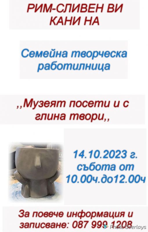 На 14 октомври (събота) от 10.00 до 12.00 часа, в сградата на Регионален исторически музей „Д-р Симеон Табаков“ – Сливен, ще се проведе семейна творческа работилница за изработка на предмети от глина.