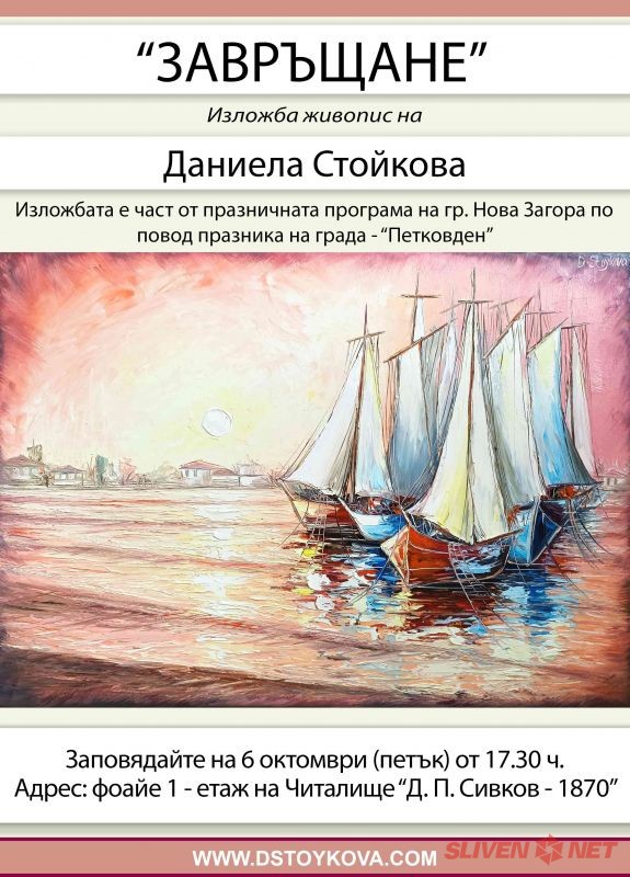 Изложбата „Завръщане“ е част от празничната програма на гр. Нова Загора по повод празника на града – „Петковден“. Тя включва 40 авторски творби, които разкриват различни аспекти от творчеството на Даниела Стойкова.