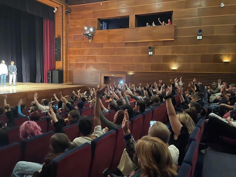 Част от учениците актьори на театрална трупа „Опит за летене“ към Хуманитарната гимназия стартираха новата учебна година с участие във форум-театър. Нашите възпитаници демонстрираха умения и опит в иновативния метод, в който чрез средствата на театъра се разрешават реални конфликтни ситуации. Представлението „Алисия в страната на веществата“, с режисьор Явор Костов, е разработено по проект "Нова нагласа", реализиран от театър "Цвете", отразява социалните проблеми като трафик на хора и разпространението на наркотици сред подрастващите. За всички участници и гости, най-вълнуващата част беше взаимодействието с публиката и възможността зрителите да предлагат различен ход на сценичното действие за героите. Актьорите от ученическата трупа „Опит за летене“, устояха с впечатляващ професионализъм на предизвикателствата и партньорствата с публиката. Създаването и практикуването на иновативния метод „Форум-театър“ е своеобразен инструмент учениците да опитат в безопасна среда различни модели на поведение и сами да намират решение на житейски и училищни конфликти. Щастливи сме, че можем да предоставим тази възможност на нашите театрални таланти.
