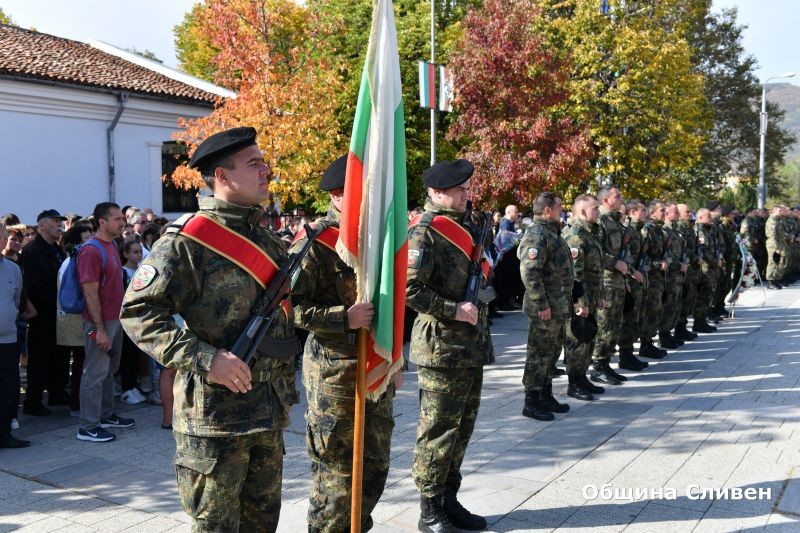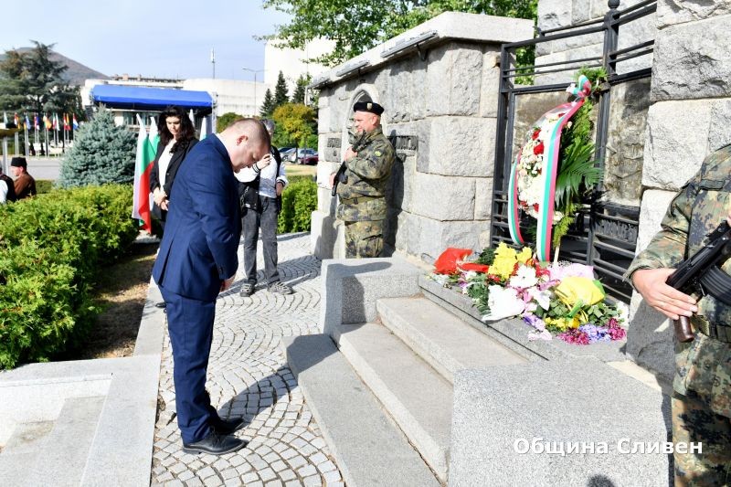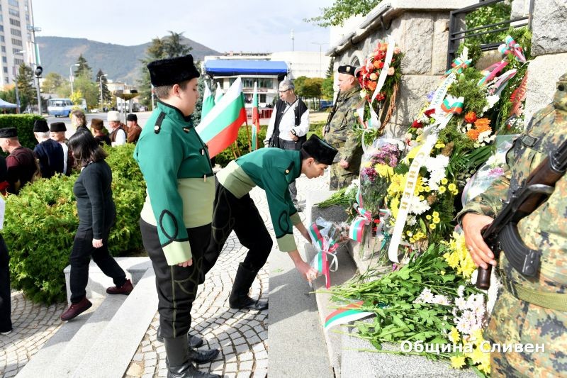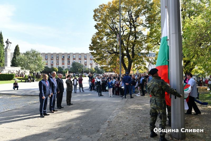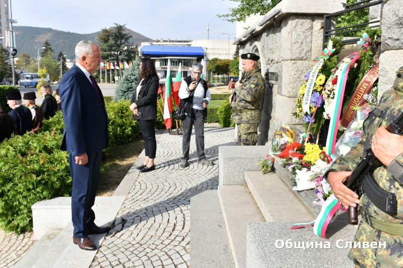 Празникът продължи с тържествен ритуал по издигане знамената на България, на Европейската общност и на Община Сливен. Венци и цветя бяха поднесени от изпълняващия длъжността кмет Румен Иванов, народните представители Мария Белова и Деян Дечев, изпълняващия длъжността областен управител Чавдар Божурски, председателя на Общински съвет-Сливен Димитър Митев и общински съветници, началника на Гарнизон-Сливен полк. Любомир Вачев, директора на Областна дирекция на МВР ст. комисар Димитър Величков, началници и директори от институциите в града, военно-патриотични съюзи, граждански сдружения, политически партии и организации, много граждани и ученици. Цветя и венци бяха поднесени и от името на Негово Високопреосвещенство Сливенският Митрополит Иоаникий и народните представители Десислава Танева, Татяна Султанова, Климент Шопов, Хатидже Георгиева.