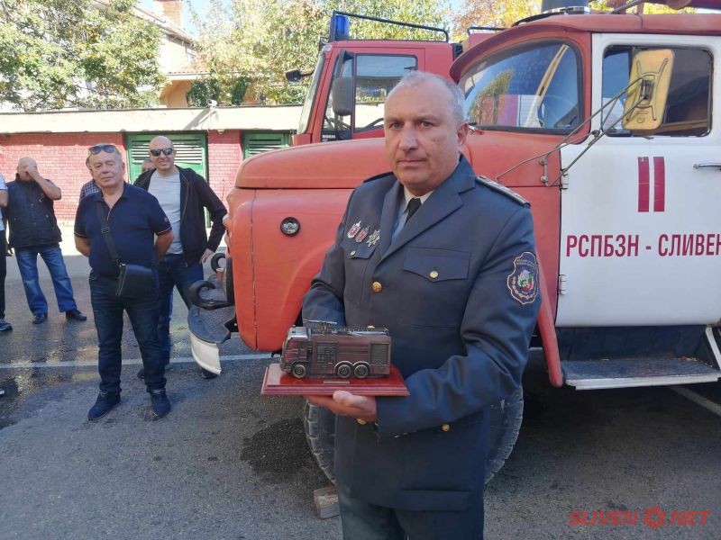 Към пожеланията за здраве и късмет се присъединиха и неговите колеги, които му връчиха плакет и специално изработена пластика на пожарен автомобил, която да му напомня годините като огнеборец.
