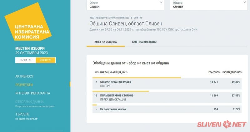 При 100% обработени протоколи кандидатът за кмет на партия ГЕРБ Стефан Радев печели с 59.33% пред Пламен Стоянов от "Пряка демокрация" с 37.89%.