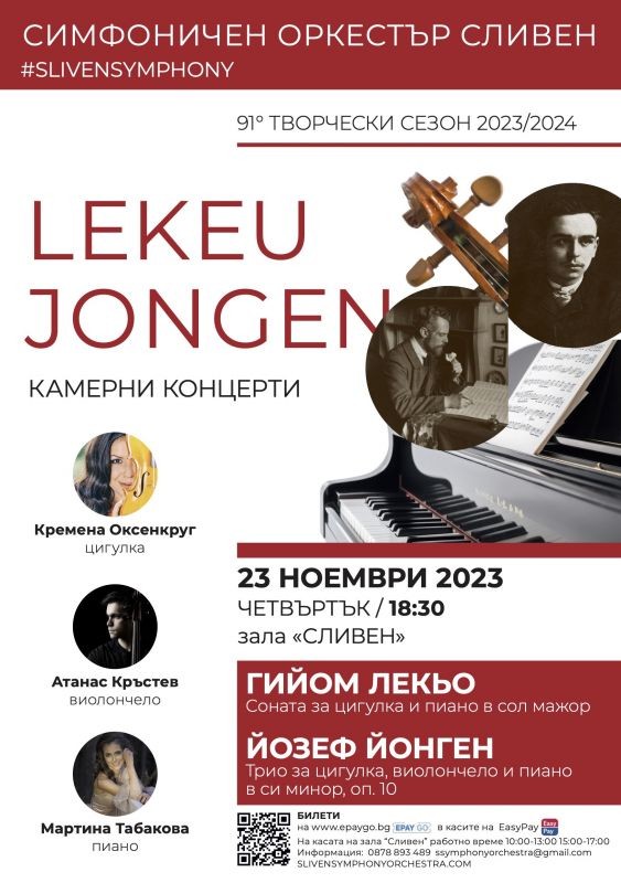 На сцената на зала „Сливен” ще бъде и българската премиера на Триото за цигулка, виолончело и пиано оп. 10 от Йозеф Йонген, друг влиятелен белгийски композитор с уникален и завладяващ музикален изказ.