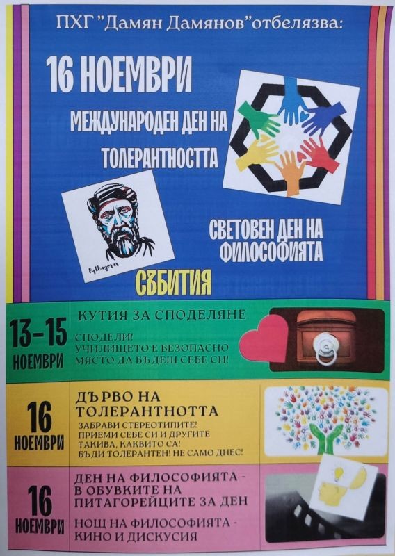 Други събития в програмата за деня ще бъдат достъпните кутии за споделяне на лични истории и предложения за подобряване на творческата и приятелска атмосфера в Хуманитарна гимназия. Aтрактивна дейност ще бъде и рисуването на „Дърво на толерантността“, също така в края на учебния ден ще се проведе „Нощ на философията – кино и дискусия“.
