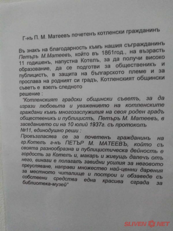 Котленската библиотека почете 80-годишнината от смъртта на своя патрон – Петър Матеев със специален кът в читалнята си. В него са разположени книги, документи и сборници, които самият котленец дарява на местната библиотека.