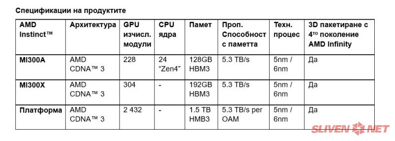 Санта Клара, Калифорния, САЩ — 6 декември 2023 г. — Днес, AMD (NASDAQ: AMD) обяви пазарния дебют на ускорителите AMD Instinct™ MI300X, с водеща производителност за генеративни AI приложения, машинно обучение и работа с големи езикови модели. Заедно с това компанията пуска AMD Instinct™ MI300A – ускорен процесорен модул (APU), съчетаващ най-новата архитектура AMD CDNA™ 3 и „Zen 4“ CPU за революционна производителност за HPC среди и AI натоварвания.