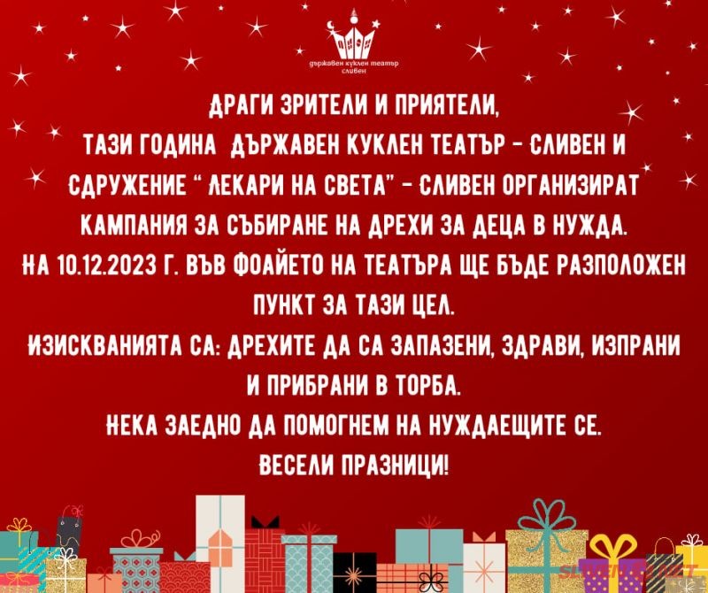 От 10.12.2023 г. до края на месеца във фоайето на театъра ще бъде разположен пункт за тази цел.
