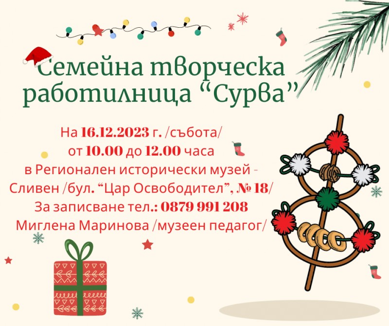 На 16 декември (събота) от 10.00 до 12.00 часа, в сградата на Регионален исторически музей „Д-р Симеон Табаков“ – Сливен, ще се проведе последната за годината семейна творческа работилница за изработка на сурвакници.