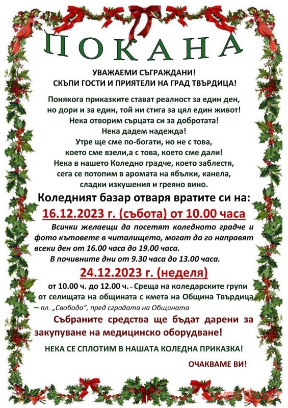 Община Твърдица кани своите съграждани, приятели и гости на Коледния базар, който отваря врати на 16 декември 2023 г., събота от 10 часа.