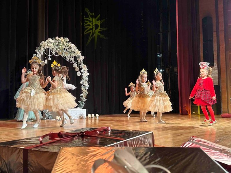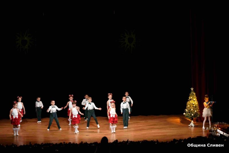 Концертът бе от децата за децата. От самото начало изпълнителите бяха поощрявани от публиката с усмивки и аплаузи. Спектакълът започна с разказ за коледния сън на момиченцето Ая, после пренесе зрителите в Коледна Виена, с езика на танците малчуганите разказаха за всичко, което ги вълнува на светлите празници – снежинките, зимната въртележка, звънчетата, вълшебствата на коледните ангели и коледната нощ. Имаше и „Кристален валс“ по Шопен, забавления на хорото с коледуване и сурвакане, не беше забравена и „Силата на любовта“. На сцената се сменяха декори, светлини, великолепни артистични костюми. Децата и техните педагози показаха блестящ спектакъл, за който са се подготвяли с много желание и въображение. Настроение създаде и водещият – известният сливенски актьор Димитър Марков. Кратките антракти той запълни с гатанка за шейната и предложение „Хайде да попеем!“. Гатанката получи хоров отговор. А „Пей, звънче“ и „Дядо Коледа не спал“, оказа се, знаят всички. Очаквано, белобрадият старец бе голямата звезда сред всички малки звезди в залата. Под празничната елха на сцената бяха пакетите – подаръци за всяка детска градина. За разкош, празникът приключи с плодове и лакомства за малчуганите.