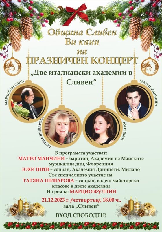 Община Сливен кани жителите и гостите на града на празничен концерт „Две италиански академии в Сливен“. В концерта ще пеят Матео Манчини – баритон, от Академия на Майските музикални дни във Флоренция и Юхи Шин – сопран, от Академия Доницети, Милано. Специално участие ще вземе оперната прима Татяна Шиварова, водещ майсторски класове в двете академии. На рояла – Марцио Фуллин.