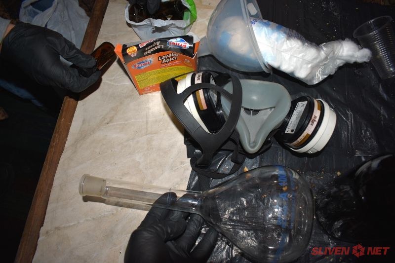 Спецоперацията срещу производството и разпространението на наркотични вещества е проведена късно вечерта на 20 декември от служители на сектор „Криминална полиция“ в РУ-Сливен. В хода на полицейските действия криминалистите предприели претърсване във вилен имот край град Сливен. На място, в момент на производство на дрога, са заловени двама криминално проявени местни жители - на 49 и 33 години. В едно от помещенията е установена изградена лаборатория за производство на синтетична дрога. При процесуално-следствените действия са намерени 5-литрови туби с течност, съдържанието на едната от които е реагирало на метамфетамин. Иззети са прекурсори, голямо количество блистери с таблетки, както и множество други вещества и предмети, служещи за производството на синтетичния наркотик. Последвало претърсване и в дома на единия от задържаните, където криминалистите открили близо 2 килограма суха зелена листна маса- чай за пушене, 11 пластмасови туби, съдържащи различни по вид течности и вещества. Течността на една от тубите дала характерната реакция за метамфетамин при извършения полеви наркотест. Иззети са и около 250 грама бяло кристалообразно вещество, индекирало на метамфетамин, както и огромно количество използвани блистери, ампули и други вещества, необходими за производството на синтетичен наркотик.