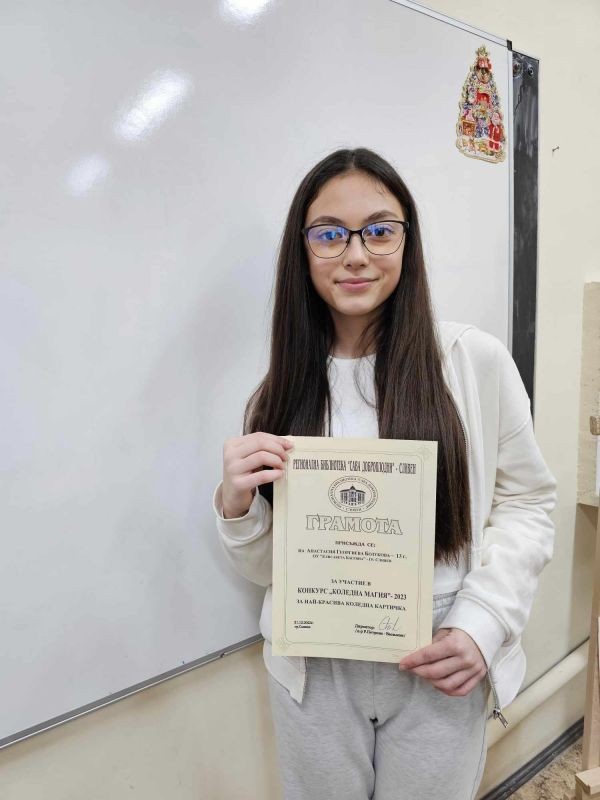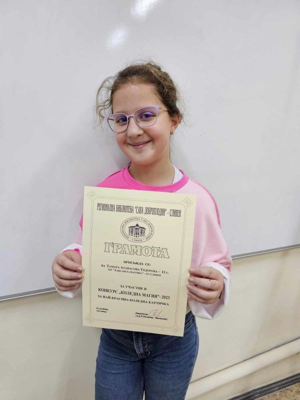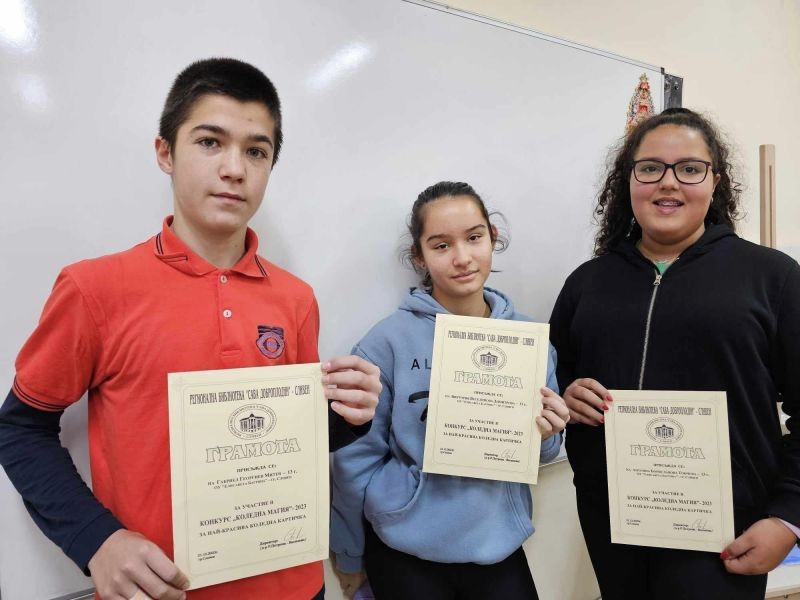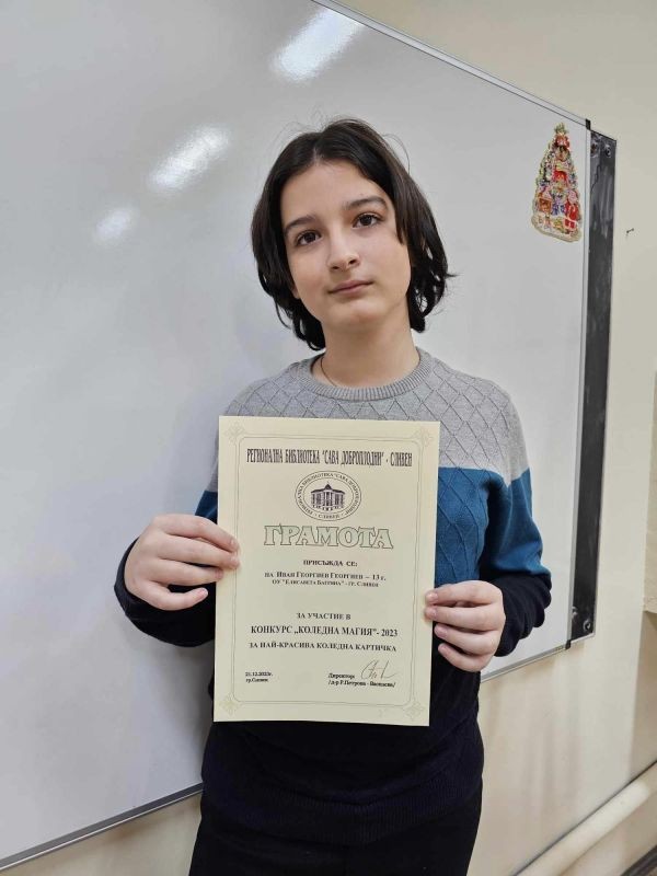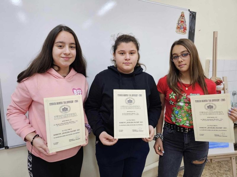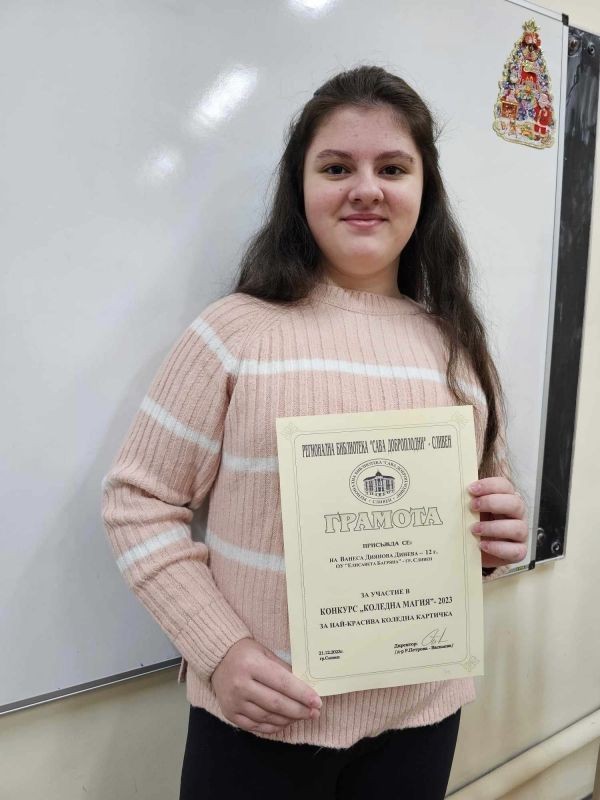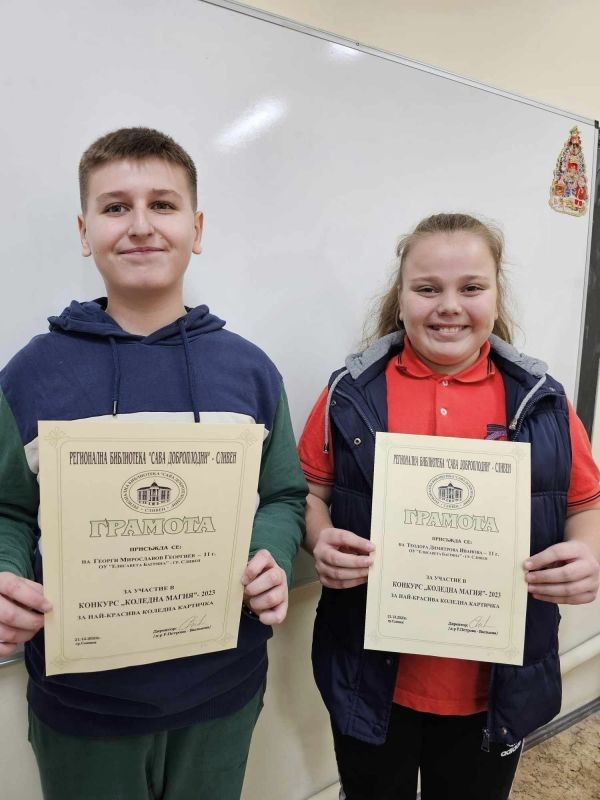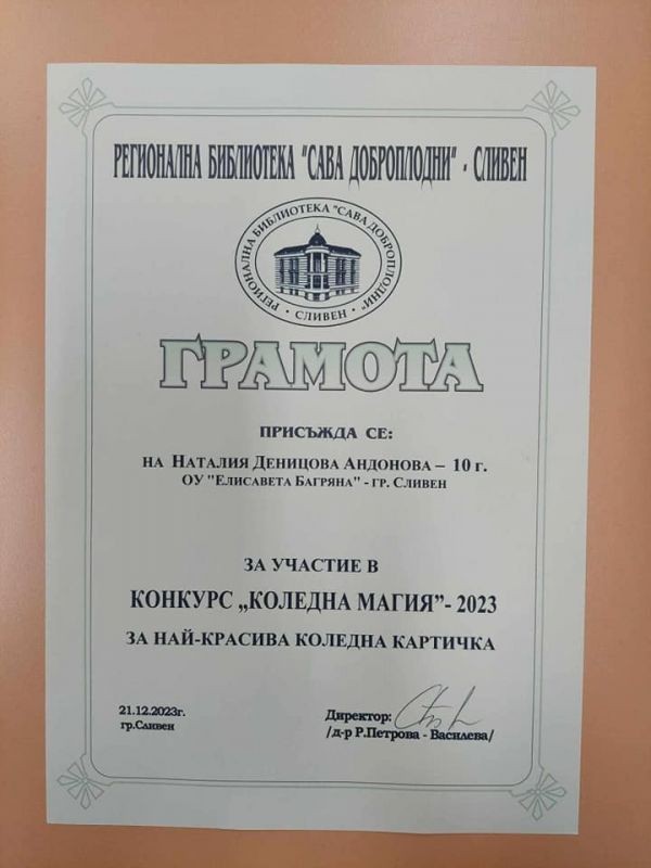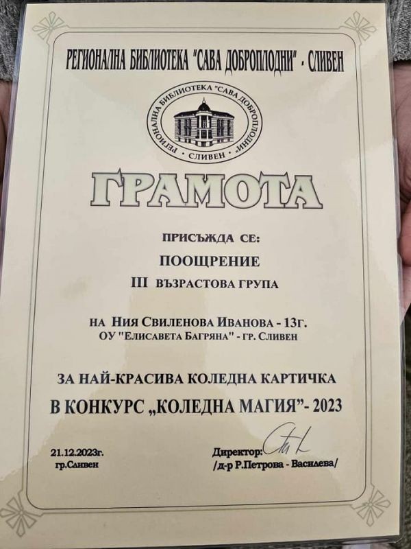 На 21.12.2023 г. в РБ "Сава Доброплодни” - Сливен се състоя награждаването на участниците в конкурса за коледна картичка и оригинално коледно пожелание „Коледна магия“ – 2023. На награждаването присъстваха директорът на ОУ "Елисавета Багряна" г-жа Величка Христова и учителите г-жа Здравка Долушанова и г-жа Славка Калчева.