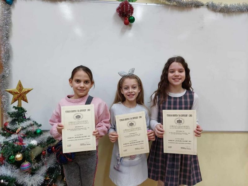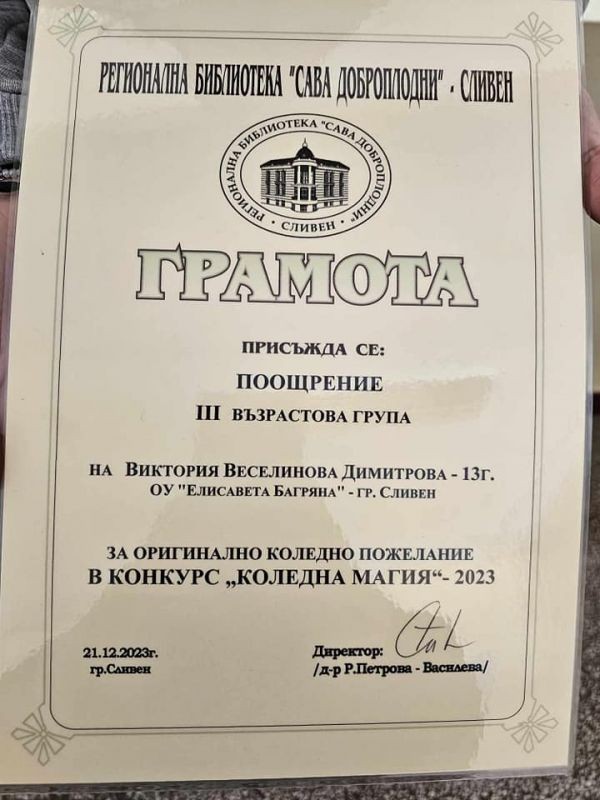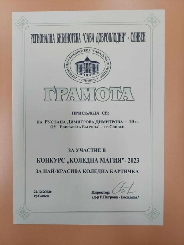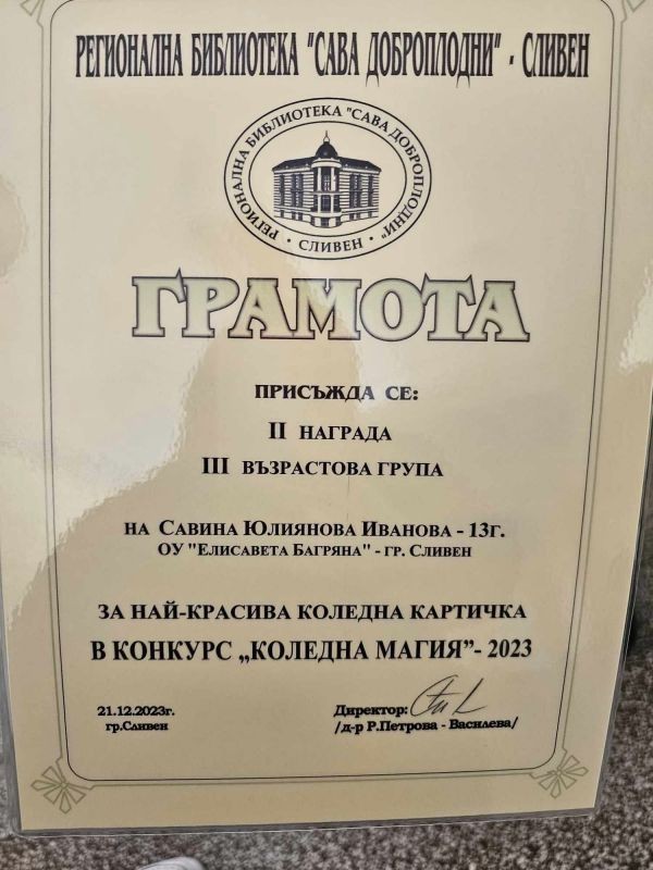 На 21.12.2023 г. в РБ "Сава Доброплодни” - Сливен се състоя награждаването на участниците в конкурса за коледна картичка и оригинално коледно пожелание „Коледна магия“ – 2023. На награждаването присъстваха директорът на ОУ "Елисавета Багряна" г-жа Величка Христова и учителите г-жа Здравка Долушанова и г-жа Славка Калчева.