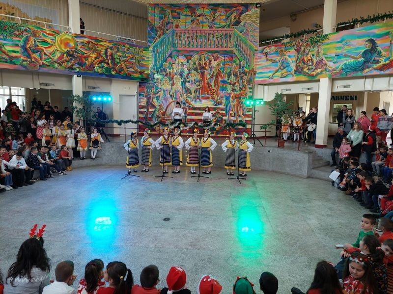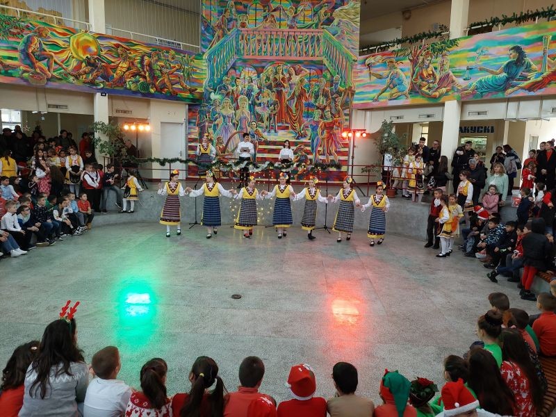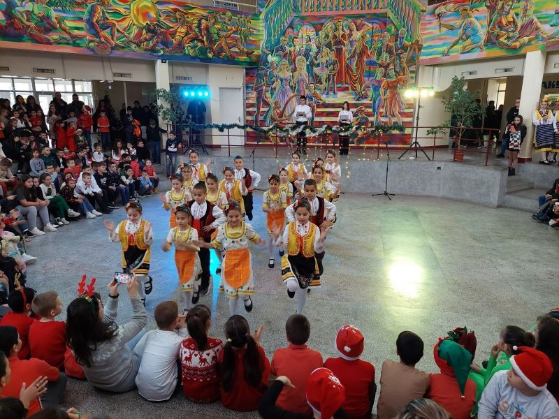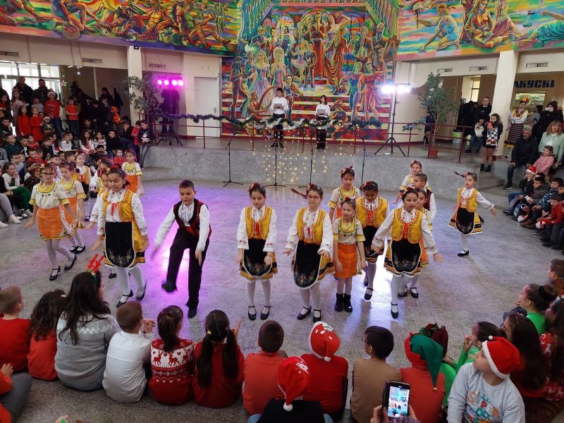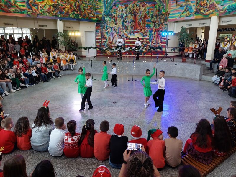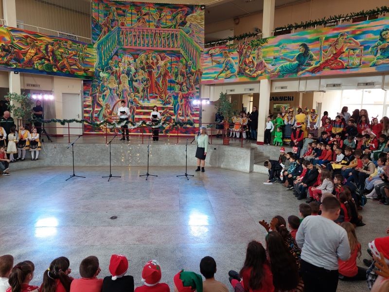 Ученици, учители и родители се събраха във форума, за да изгледат празничната програма на училището по случай Коледа и Нова година.