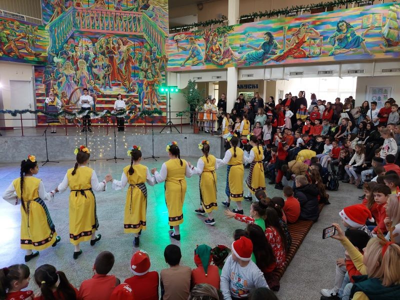 Ученици, учители и родители се събраха във форума, за да изгледат празничната програма на училището по случай Коледа и Нова година.