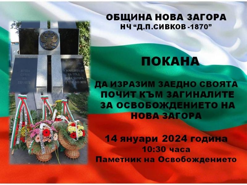 Наближава паметния за нашия град 14 януари – денят, в който Нова Загора е посрещнала Свободата. За всички нас тя е свещена, а цената й е извоювана от хилядите войни, пожертвали се за нея. Ще ви очакваме пред Паметника на Освобождението на 14 януари 2024 г., неделя, в 10:30 часа, за да сведем глави пред тяхната памет, да си припомним подвига им и да се преклоним пред величието на българския дух.