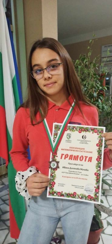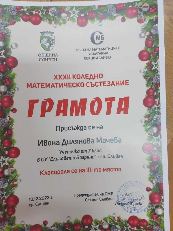 Директорът на ОУ "Елисавета Багряна", г-жа Величка Христова, поздрави Ивона Мачева от 7. "г" клас за отличното ѝ представяне в Коледното математическо състезание. Ивона се класира на трето място. Своята грамота тя получи на официална церемония по награждаване на отличените участници, която се състоя в Регионалното управление на образованието на 11 януари.