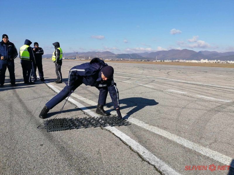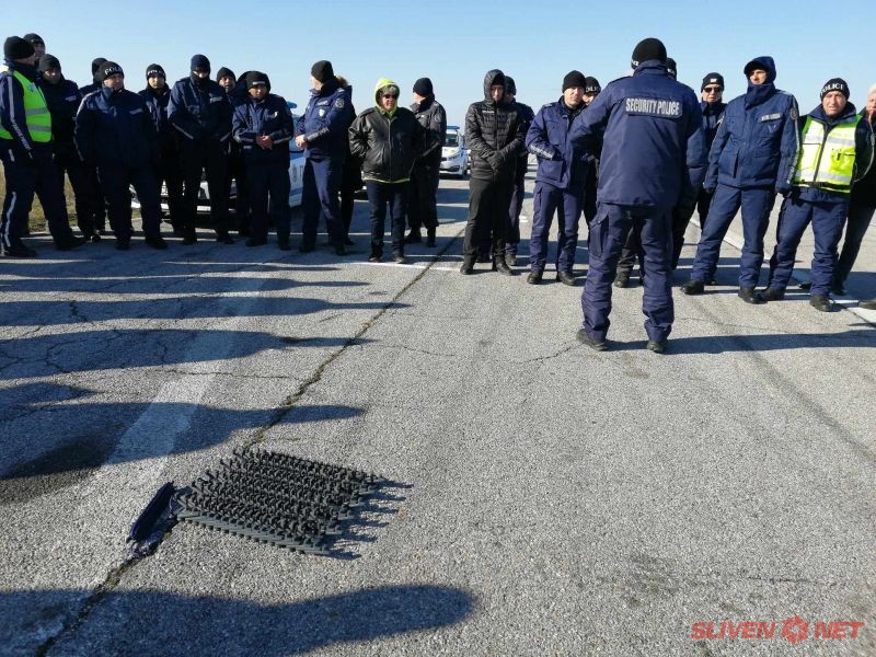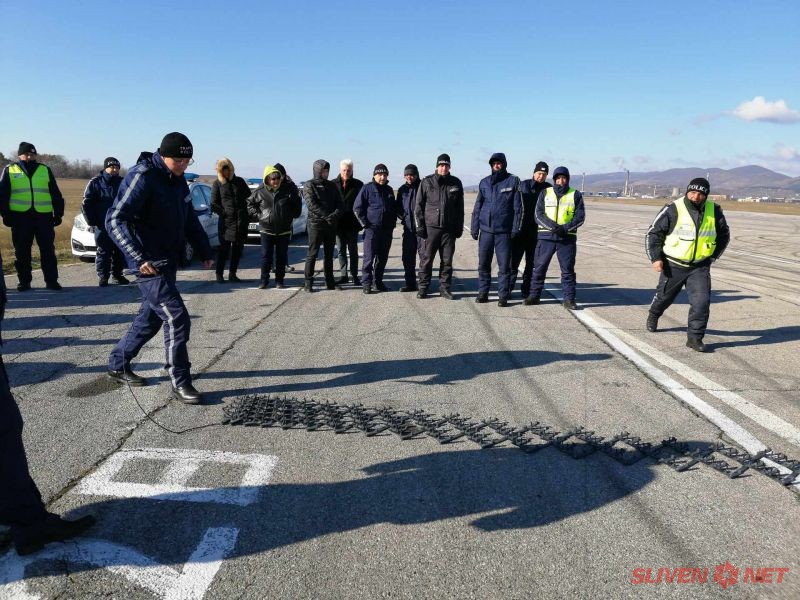 Продължава обучението по надграждане на професионалните умения на полицейските служители. Принудително спиране на автомобил с помощта на помощни средства бе проведено днес на летище „Бършен” край Сливен. Служители на отдел „Охранителна полиция” към ОДМВР-Сливен проведоха занятие по използване на ленти за принудително спиране. Служители с полицейски правомощия от районните управления в Сливен, Котел и Твърдица, дежурните части, пътна полиция и група „Миграция” тренираха изграждане на КПП, преследване на автомобил и разпъване на лента с шипове. Всички служители, независимо дали им се налага в ежедневната работа да прилагат тези способи, преминаха обучението като приложиха в действие заложеното в теоретичната част. Всеки трябваше да отработи техниката, докато не се получи гладко изпълнение, за да се гарантира бърза и резултатна реакция при реална ситуация.