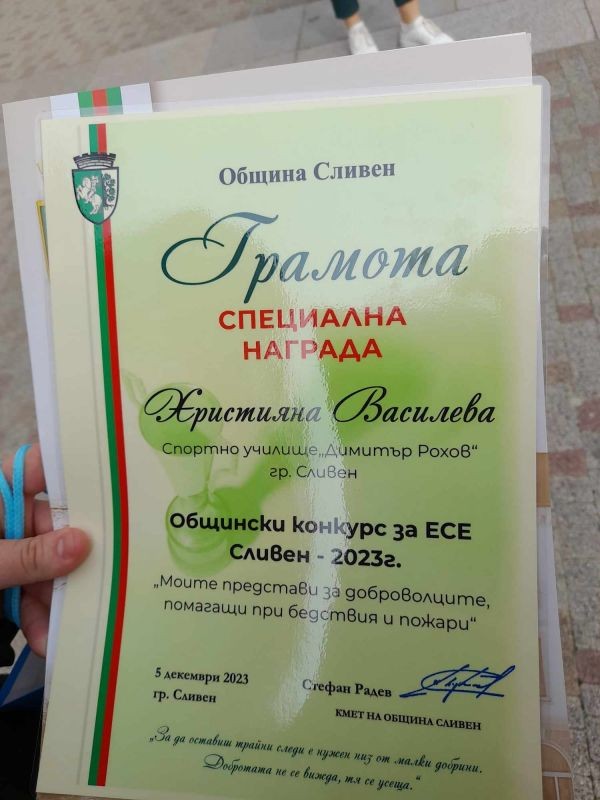 Една специална награда на Християна Василева от 11.А клас и 4 грамоти за деветокласничките Марияна Узунова, Симона Иванова и Далия Георгиева и Десислава Георгиева от 8. А клас допълниха днес актива от отличия на изявени ученици от СУ „Д. Рохов“. Всички получиха и сертификати за участие и награди от Община Сливен.