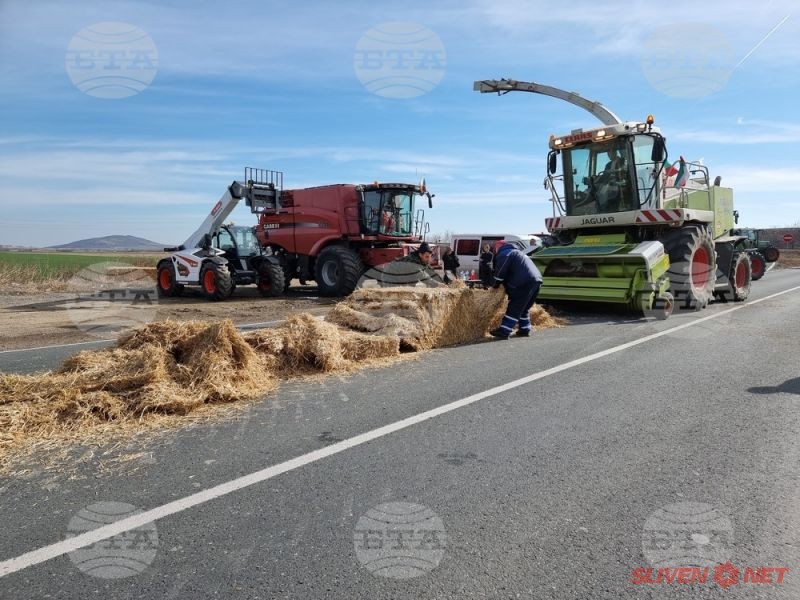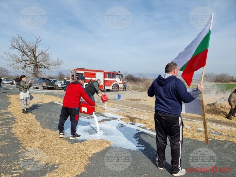 Протестиращите земеделци на пътя Ямбол – Сливен запалиха бали слама и разляха мляко