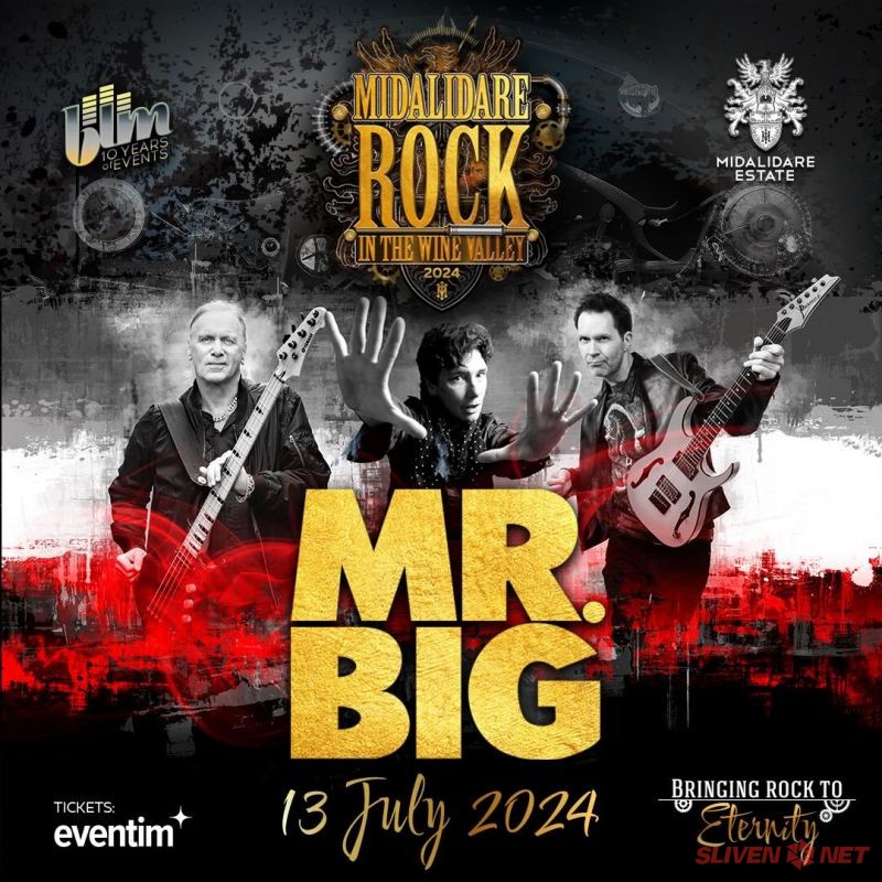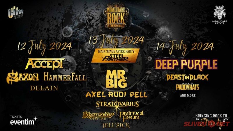 Midalidare Rock In The Wine Valley от 12 до 14 юли 2024 г. Билетите са в продажба в мрежaта на Eventim в цялата страна, както и в OMV, Билетен център на НДК, Технополис и Български пощи.