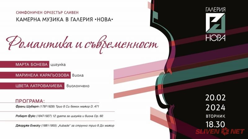 Първото събитие “Романтика и съвременност” ще се състои на 20 февруари с участието на струнно трио в състав Марта Бонева (цигулка), Маринела Карагьозова (виола) и Цвета Латровалиева (виолончело). В програмата на концерта са включени Струнното трио в си бемол мажор - една от незавършените творби на Франц Шуберт (1797-1828). Дванадесетте дуета за цигулка и виола от Роберт Фукс (1847-1927), са кратки портретни миниатюри на Виена от края на 19 век. Композицията "Aubade" от Джордже Енеску (1881-1955), е сутрешна песен или поема за любовта.