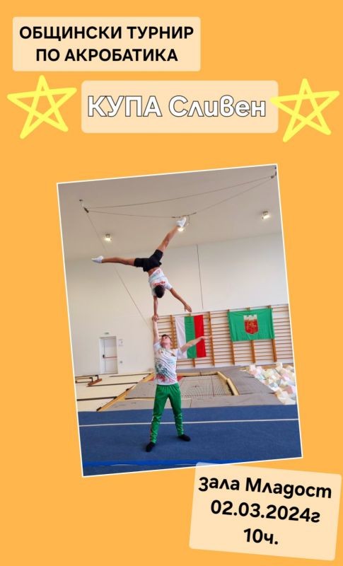Сливен ще посрещне млади спортни надежди от Пловдив, Бургас, Варна и Айтос за участие в общинския турнир по акробатика за Купа „Сливен“. Събитието на 2 март ще започне в 10 часа в зала „Младост“. Ще се изявят над 200 от най – добрите състезатели на пловдивския клуб „Акродинамика“, на „Акро старс“ и „Акро - джъмп“ от двата морски града, на клубовете „Ейнджълс“ и „Орел“ от Айтос, както и на домакините – Клуба по спортна акробатика „Стефан Данчев“ с треньор Виолета Бинева, съобщиха от общинския пресцентър.