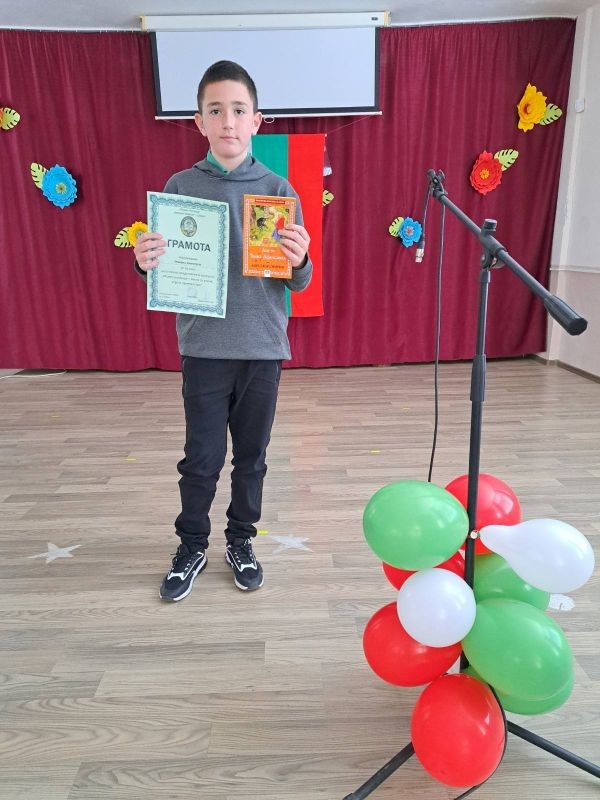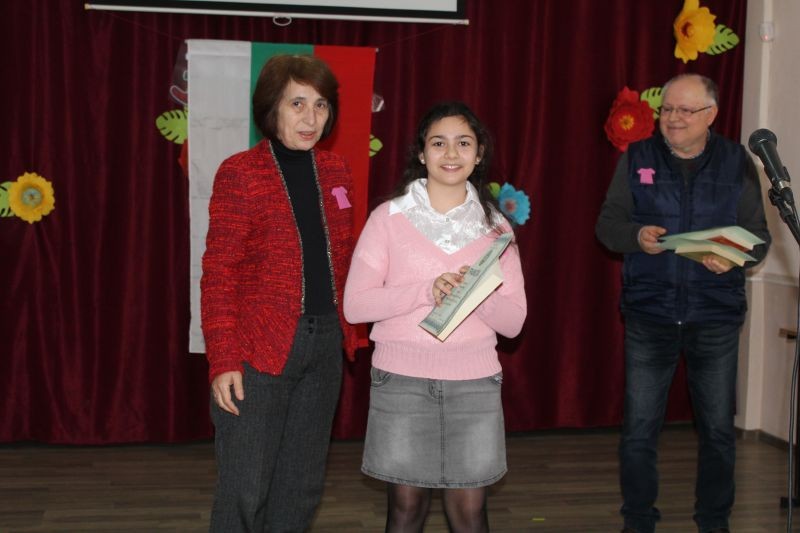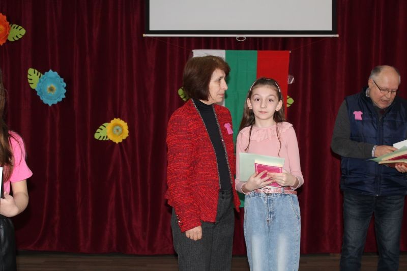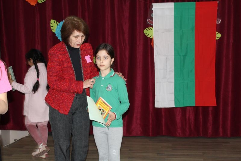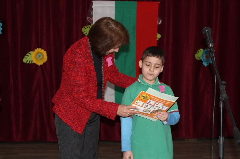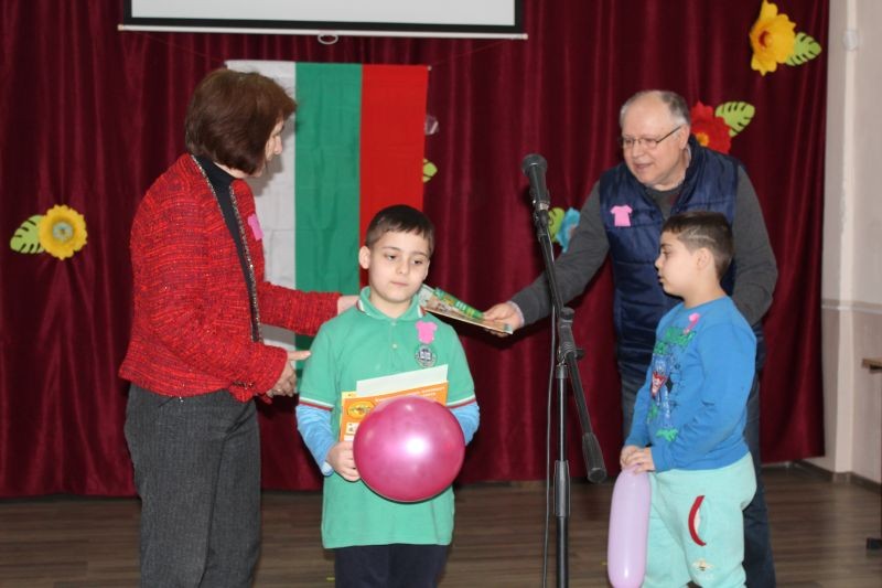 Директорът на училището г-жа Диана Кънева поздрави учениците и награди най - добре представилите се в конкурса „Моето училище, място за учене, игри и приятелство“. В него се включиха учениците от начален етап, които представиха 62 рисунки. Сред отличените рисунки са тези на учениците: Владимир и Георги Стайкови от 1. б клас, Бориса Димитрова от 1. а клас, Илияна Хисапчиева от 2. а клас, Анелия Василева и Ана-Мария Стоянова от 2. б клас, Мадлен Георгиева, Алина Шуляк, Михаил Димитров от 3. а клас, Йоана Стайкова от 4. а клас, Никол Маринова и Неделина Добрева от 4. б клас. Най-активни бяха учениците от 3. а клас с класен ръководител г-жа Събина Кутрова. С постер, посветен на събитието се включиха и учениците от група ЦОУД – 4. клас с ръководител г-жа Таня Чотова.