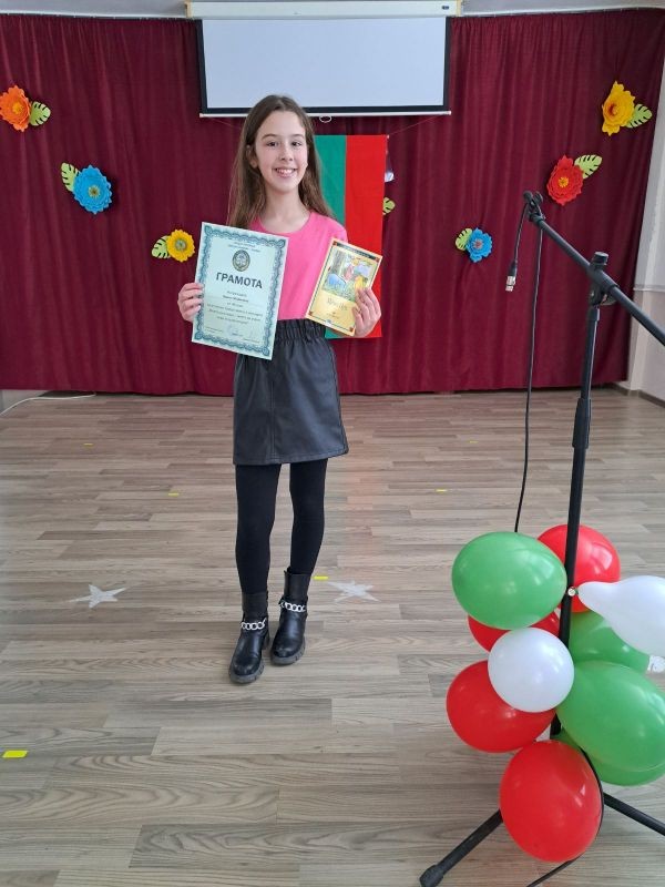 Директорът на училището г-жа Диана Кънева поздрави учениците и награди най - добре представилите се в конкурса „Моето училище, място за учене, игри и приятелство“. В него се включиха учениците от начален етап, които представиха 62 рисунки. Сред отличените рисунки са тези на учениците: Владимир и Георги Стайкови от 1. б клас, Бориса Димитрова от 1. а клас, Илияна Хисапчиева от 2. а клас, Анелия Василева и Ана-Мария Стоянова от 2. б клас, Мадлен Георгиева, Алина Шуляк, Михаил Димитров от 3. а клас, Йоана Стайкова от 4. а клас, Никол Маринова и Неделина Добрева от 4. б клас. Най-активни бяха учениците от 3. а клас с класен ръководител г-жа Събина Кутрова. С постер, посветен на събитието се включиха и учениците от група ЦОУД – 4. клас с ръководител г-жа Таня Чотова.