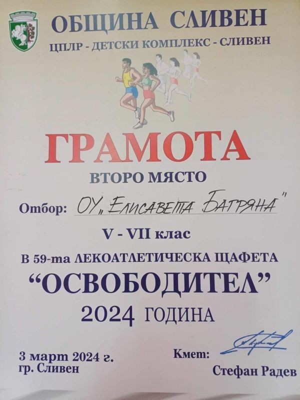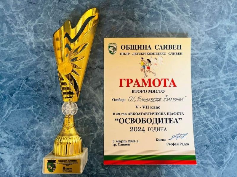 Отборът на ОУ "Елисавета Багряна" се класира на второ място в лекоатлетическата щафета "Освободител". 208 лекоатлети преминаха по състезателното трасе от 1230 м.