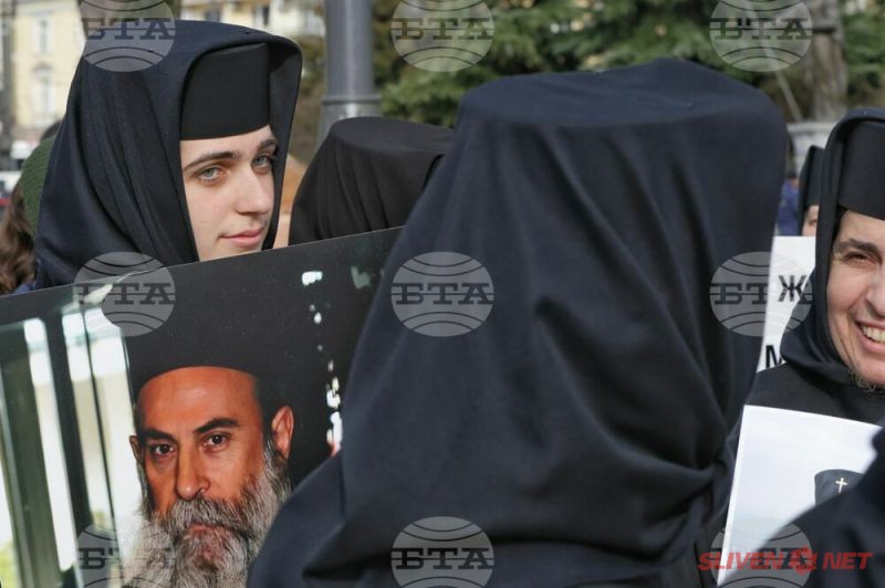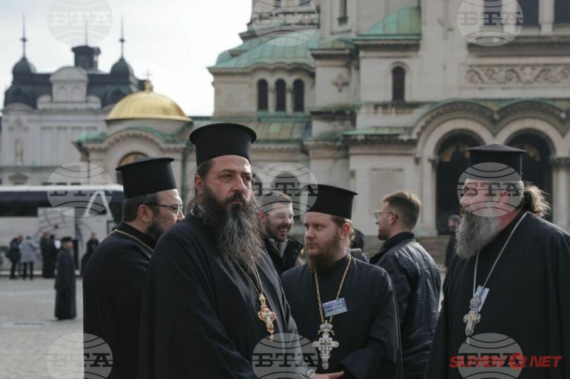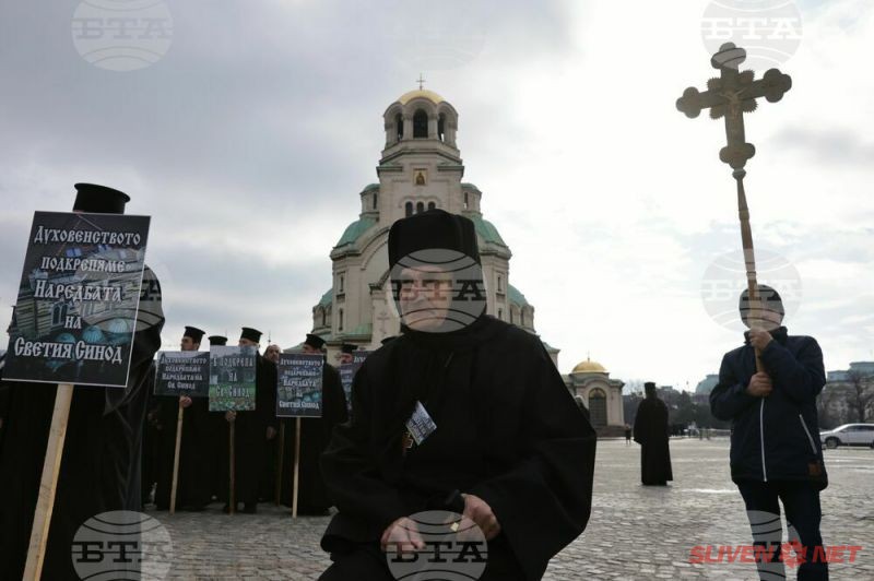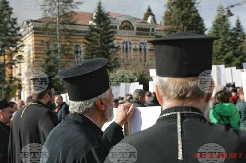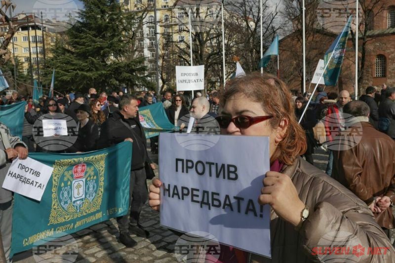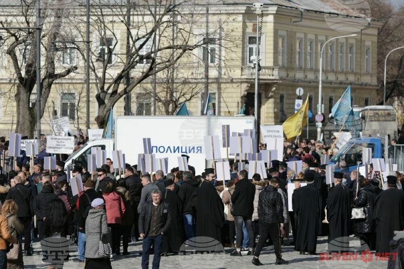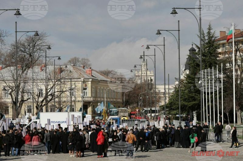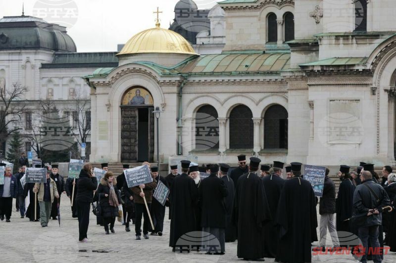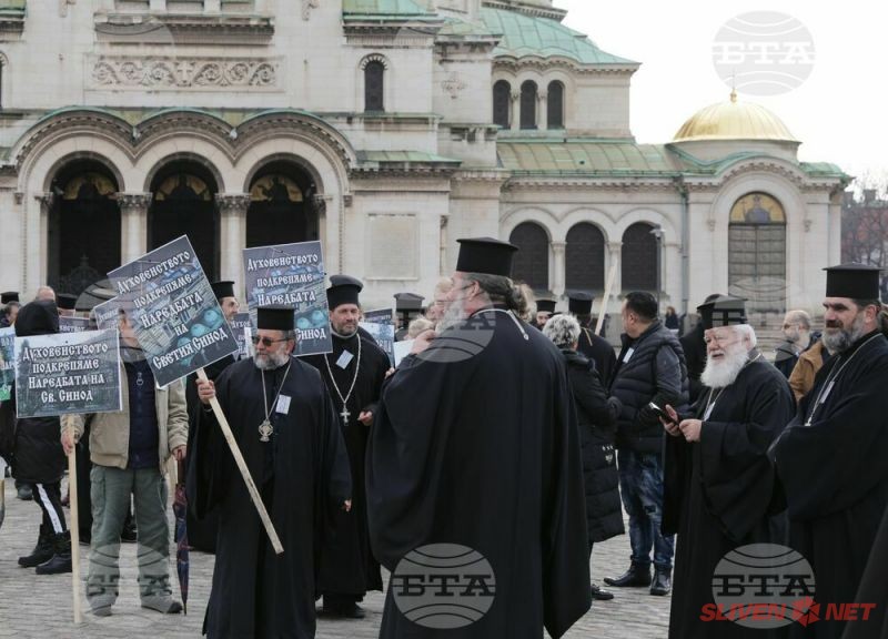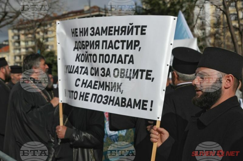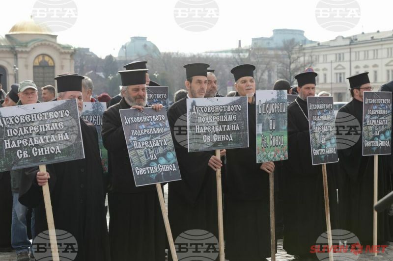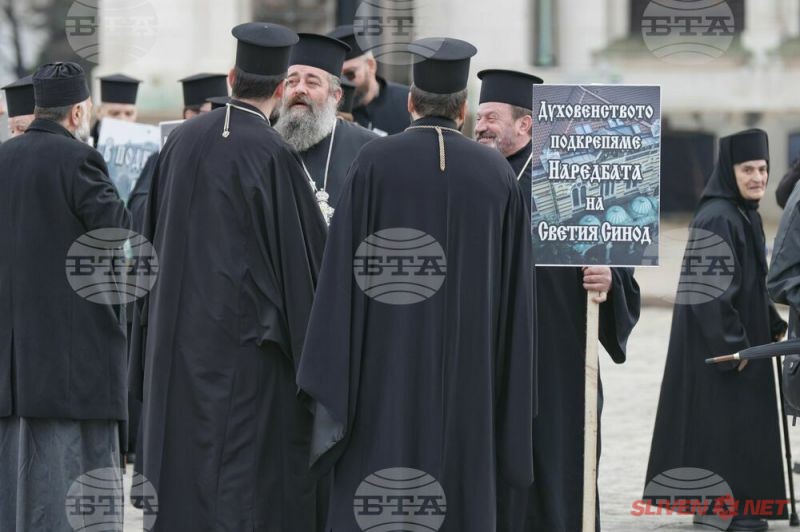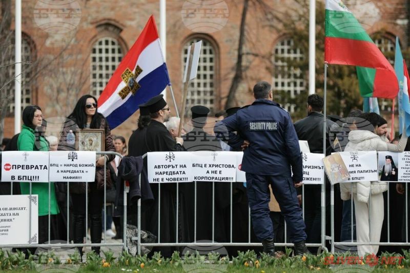 Докато митрополитите от Светия синод днес заседаваха, свещеници, епархийски избиратели и миряни участваха в протест и контрапротест пред Синодалната палата в София. Те бяха застанали от двете страни на входа на Синодалната палата и пееха църковни тропари. Една част от дошлите днес пред Синодалната палата се обявиха в защита на Синодалната наредба за избор на митрополити, приета от Светия синод на 24 февруари, след касирането на епархийския избор от 18 февруари в Сливен.
