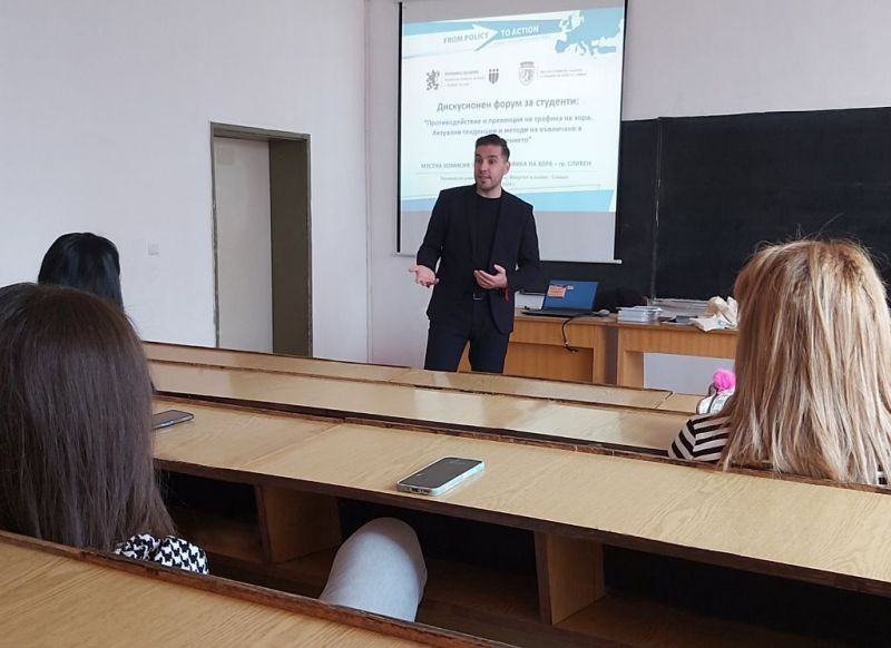 Владимир Друмев, секретар на МКБТХ – Сливен, запозна студентите с актуалните форми и тенденции при трафика на хора, като постави акцент върху сексуалната експлоатация и безопасното онлайн общуване. Бяха обсъдени интерактивните подходи на работата по превенция в училищна среда, в контекста на справяне с проблемите свързани с ранната сексуализация и рисковото поведение на деца в реална и дигитална среда.