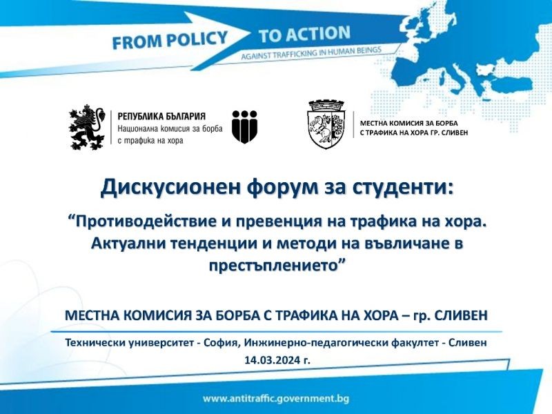 На 14-ти март 2024 г. Местната комисия за борба с трафика на хора (МКБТХ), гр. Сливен проведе дискусионен форум на тема „Противодействие и превенция на трафика на хора. Актуални тенденции и методи на въвличане в престъплението”, със студенти трети курс, специалност „Педагогика” в Технически университет – София, Инжинерно-педагогически факултет – Сливен, в рамките на дисциплина „Превантивна и корекционна педагогика”, под ръководството на гл. ас. д-р Моника Ингилизова.