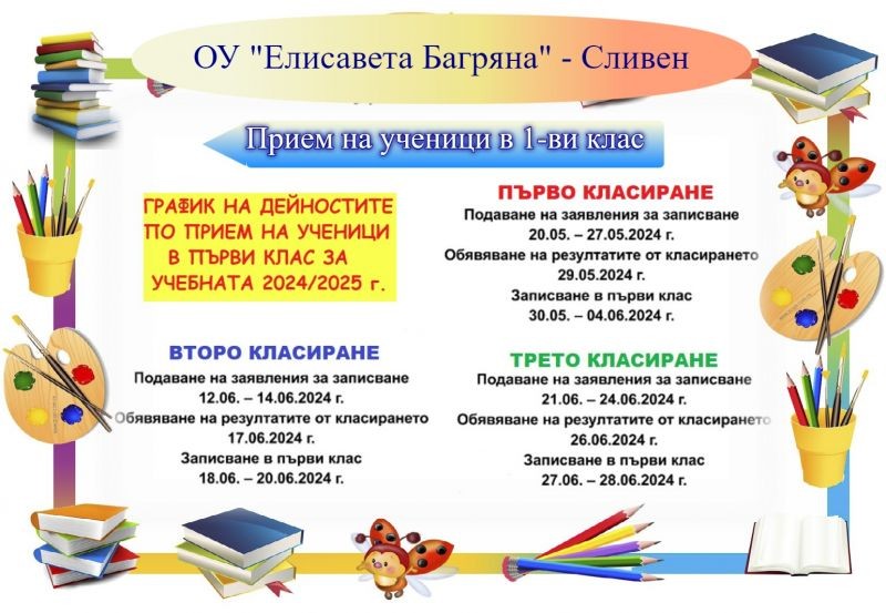 График по прием на ученици в първи клас за учебната 2024/2025 година
