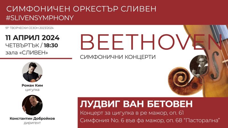 В четвъртък, 11 април, от 18.30 часа, величието на Бетовеновата музика отново ще изпълни пространството в зала „Сливен“. Концертът за цигулка и оркестър в ре мажор оп.61 от Лудвиг ван Бетовен е неизменен връх в цигулковия репертоар. Солист ще бъде гостуващият за втори път в Сливен Роман Ким. Второто произведение в програмата е Симфония No.6 оп.68, известна още като „Пасторална“. Събитието ще премине под вещото ръководство на диригента Константин Добройков.